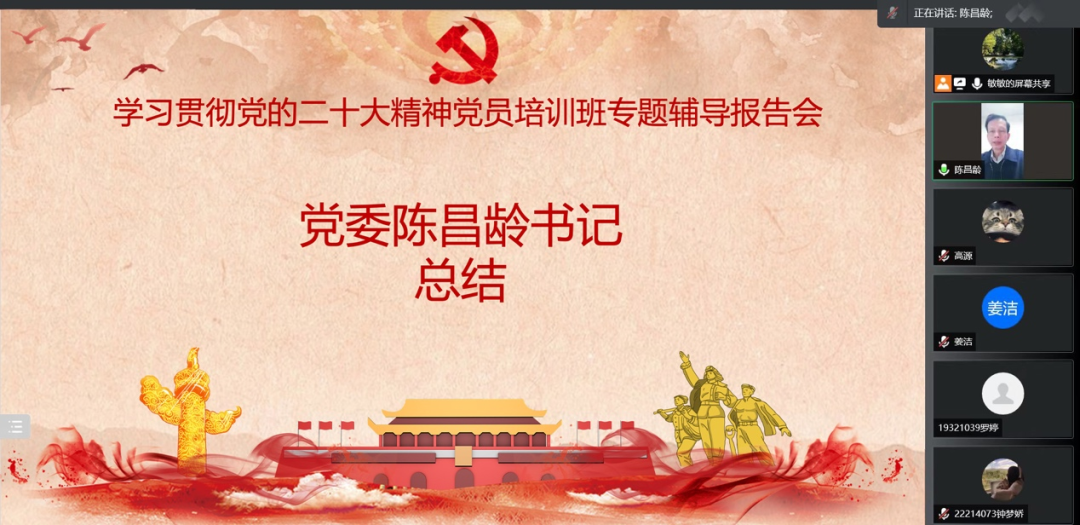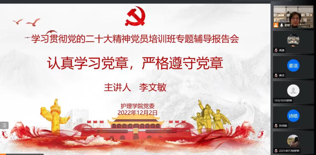 根据学院学习贯彻党的二十大精神党员培训班方案安排,12月2日晚上7点,护理学院通过腾讯会议线上举行第二次专题辅导报告会。本次报告会由学院党委副书记李文敏同志主讲,主题为“认真学习党章,严格遵守党章”。学院全体党员、发展对象、入党积极分子以及部分学生马克思主义学习小组成员约230人参加了报告会。报告会由学院党委书记陈昌龄同志主持。