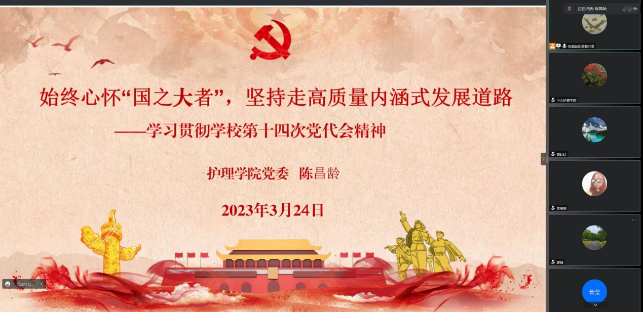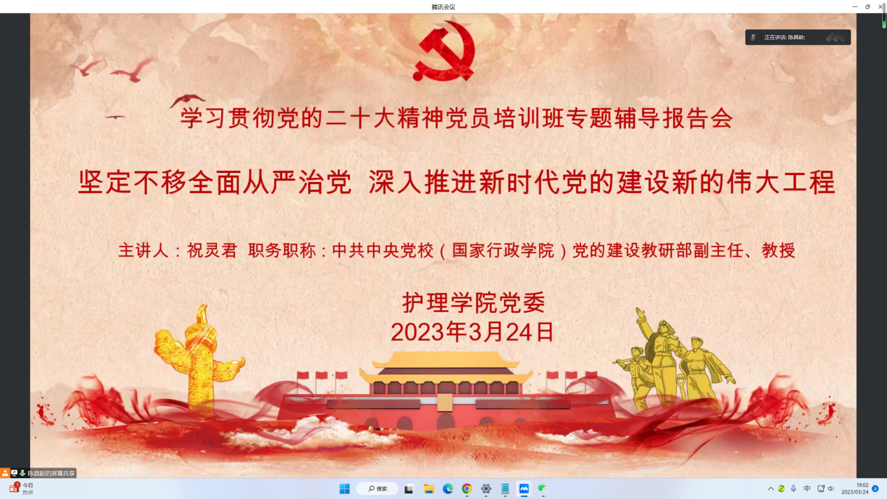 根据学院党委学习贯彻党的二十大精神党员培训班方案安排,3月24日晚上7点,护理学院党委通过腾讯会议举行学习贯彻党的二十大精神党员培训班第五次专题辅导报告会。本次专题辅导报告的主题是:坚定不移全面从严治党 深入推进新时代党的建设新的伟大工程。主讲人为:中共中央党校(国家行政学院)党的建设教研部副主任祝灵君教授 。学院全体师生党员、发展对象、入党积极分子以及马克思主义学习小组成员近300人集体收看了中国干部网络学院门户网站“学习贯彻党的二十大精神网上专题班”相关辅导报告视频。专题辅导报告会由学院党委陈昌龄书记主持。