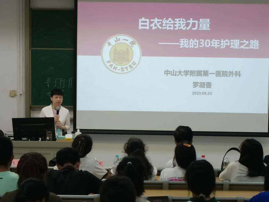 2022级临床班主任、304永利附属第一医院术科片教学片长罗凝香老师作了题为《白衣给我力量——我的30年护理之路》的分享,她结合医院发展平台,详细介绍了自己30年临床护理工作的经历,并寄语同学们要学会沉淀,读好“护理”这本“大”书,读好“实践”这本“活”书,读好“生命”这本“天”书,立足大学高地,努力成为超越老师的学生。
