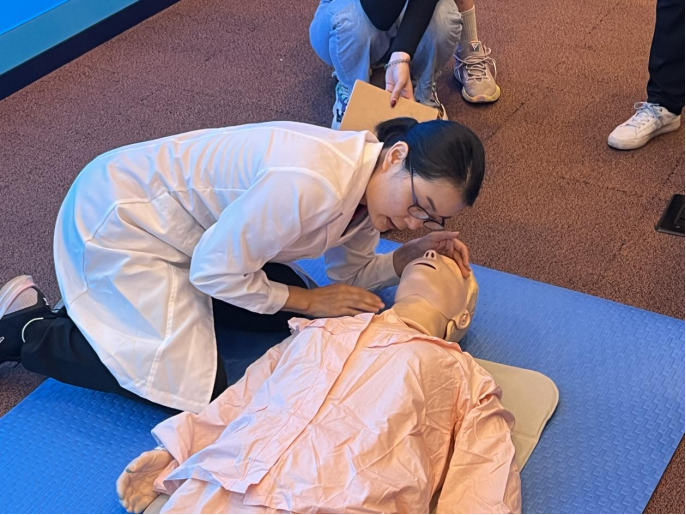 培训初始,主讲人护理学院内科教研室赵娟娟副教授向大家讲解医院外常见的突发紧急状况,如晕厥、气道异物梗阻、癫痫、溺水、卒中急性发作、心脏骤停等突发紧急状况发生的原因和特征以及各自正确的现场急救处理方法,如怎样正确进行院外心肺复苏,又如怎样正确使用除颤仪等。在讲解过程中,赵娟娟老师以视频的形式穿插真实案例,既生动又形象,参加活动的师生非常专注,认真听讲。